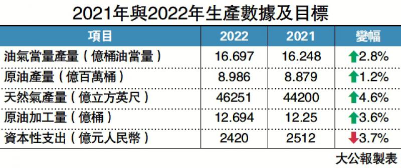 另外,中石油去年油氣當量產量16.248億桶,與2020年基本持平,今年目標產量16.697億桶增加2.8%。去年原油產量8.879億桶按年減少3.7%,今年目標產量8.986億桶增加1.2%。去年可銷售天然氣產量44200億立方英尺增加4.7%,今年目標產量46251億立方英尺增加4.6%。
