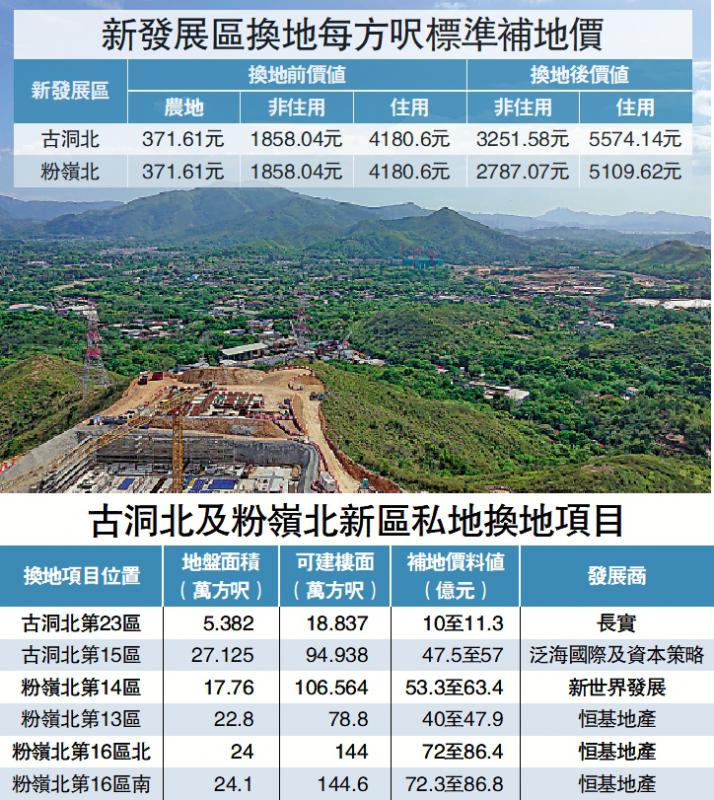 根據地政總署公布的標準補價金額資料顯示,古洞北及粉嶺北發展區內農地換地的價值每方呎只約372元;換地後作住用用途的每方呎樓面地價分別約5574元及5109元。參考之前由新鴻基地產(00016)及會德豐地產各投得的兩幅古洞北住宅地,每方呎樓面中標地價分別約7200元及8500元,業界認為標準地價具吸引力。