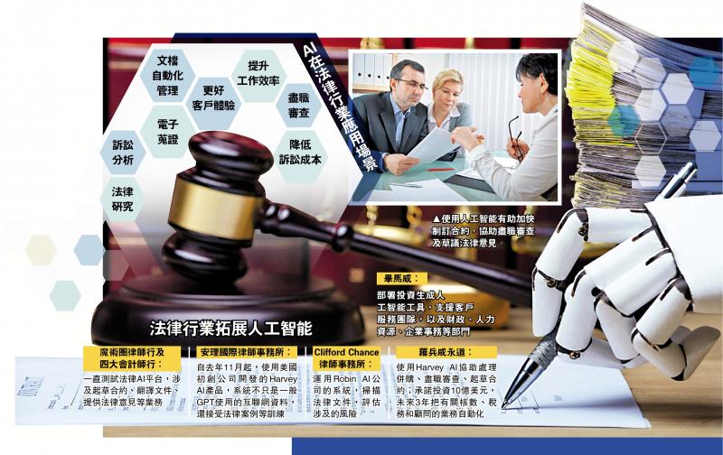 人工智能(AI)是當今熱話,不單金融服務公司爭相採用自然語言聊天機器人(ChatGPT),律師行和顧問公司也日益依賴這種高科技。律師行認為,使用人工智能有助加快制訂合約,協助盡職審查及草議法律意見。高盛預測,44%專業法律工作可以由人工智能完成,不過業界人士表示,人工智能技術生成的結果,仍需要具專業資格的人來校閱修改。\大公報記者 李耀華