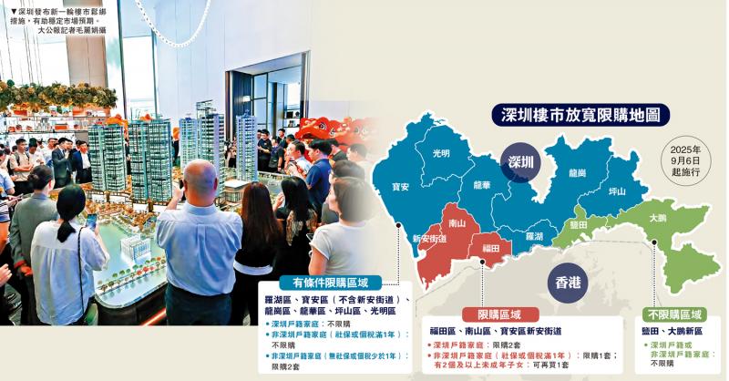 繼北京和上海後,深圳也發布新一輪樓市鬆綁措施。深圳戶籍居民、連續繳納社保或個人所得稅滿1年的非深圳戶籍居民在6個區域購房不限套數,無社保或個稅少於1年的非深圳戶籍居民限購2套,另有2個區域不再審核購房資格,自9月6日起施行。