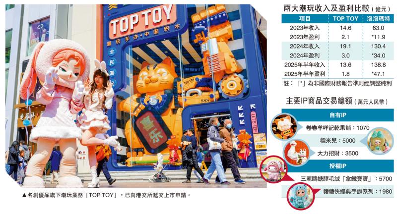 潮玩賽道企業紛紛匯聚港股。泡泡瑪特(09992)曾創下市值奇跡,布魯可(00325)也在今年上半年成功扭虧為盈,卡遊與52TOYS同樣積極籌備上市。近日,名創優品(09896)分拆旗下潮玩業務「TOP TOY」,並向港交所(00388)遞交上市申請,由摩根大通、瑞銀和中信証券擔任聯席保薦人。市場消息稱,TOP TOY擬通過是次IPO募集約3億美元(約23.4億港元)。此前,該公司還獲得淡馬錫領投的融資,交易完成後估值已升至約100億元,反映資本市場對潮玩賽道持續看好。\大公報記者 李樂兒