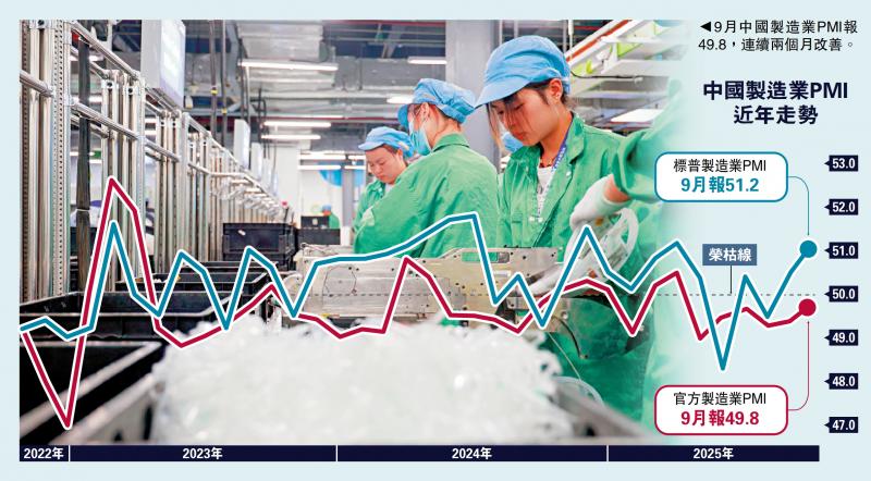標普和RD同日發布的9月中國製造業PMI升見51.2,表現強於去年同期的49.3。其中,生產指標延續升勢,代表需求的新訂單指標整體改善,特別是新出口訂單自今年3月以來首次升穿榮枯線。RD研究團隊表示,9月中國製造業改善度更全面,市場對「反內捲」工作的關注度持續提升。四季度中國出台新一輪穩增長政策的概率正在上升,「四季度中國製造業PMI有望延續擴張勢頭」。