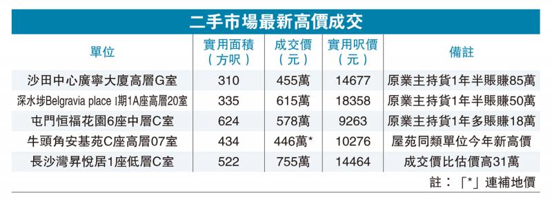 沙田上車盤昨日亦錄得炒家沽樓,代理指,沙田中心廣寧大廈高層G室2房戶,實用面積310方呎,投資者去年2月以370萬入市,剛以455萬轉手,實用呎價14677元,原業主持貨逾1年半,賬面勁賺85萬元,單位炒貴23%。