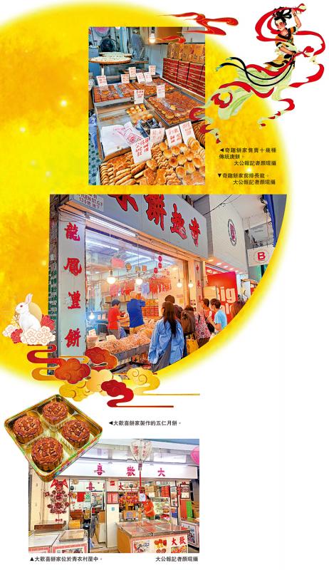 圖:(上至下)奇趣餅家售賣十幾種傳統唐餅。奇趣餅家前排長龍。大歡喜餅家製作的五仁月餅。大歡喜餅家位於青衣村屋中。\大公報記者顏琨攝
