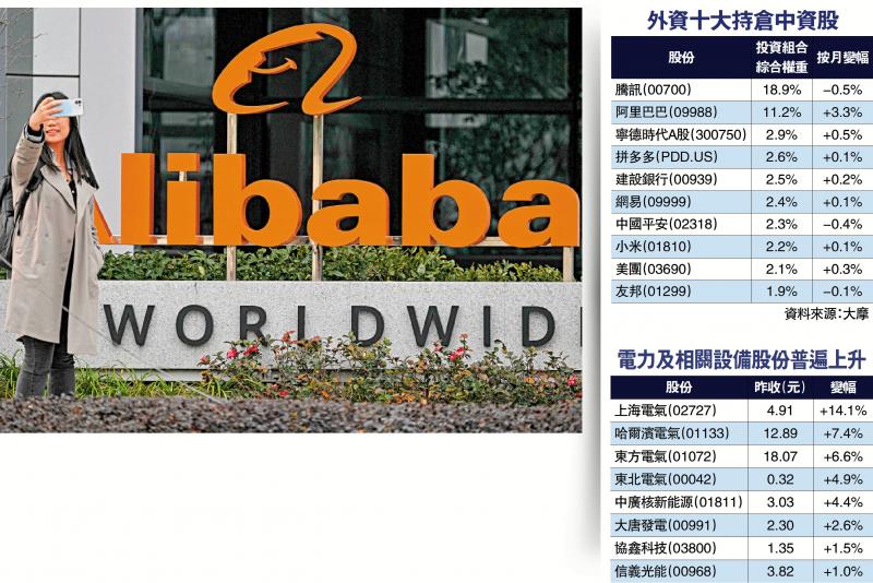 圖:外資上月增持3.3%的阿里巴巴股份,使其在外資投資組合的綜合權重達到11.2%。