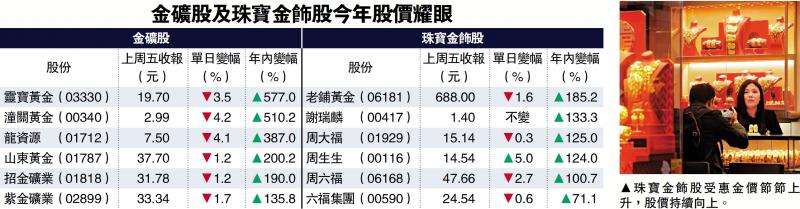 受惠國際金價屢創歷史新高,金礦股及珠寶金飾股牛氣沖天,成為股市大贏家。今年以來,靈寶黃金(03330)股價累升577%,領先同業,潼關黃金(00340)以510.2%升幅緊隨其後,龍資源(01712)則升387.01%排第三,山東黃金(01787)期內亦錄2倍升幅,回報相當「和味」。同時,珠寶金飾股亦表現奪目,老鋪黃金(06181)大漲185%。