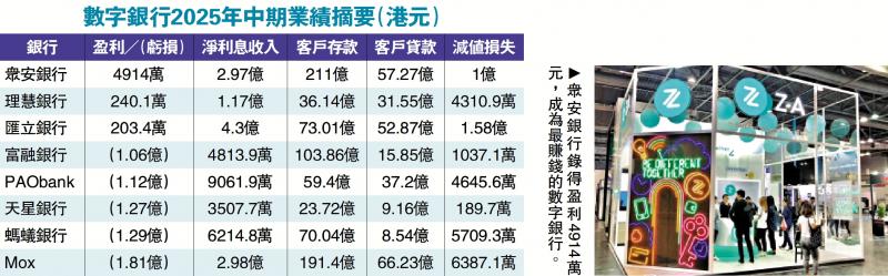 根據數字銀行公布的中期業績報告,眾安銀行錄得盈利4914萬元,成為最賺錢的數字銀行。其次是理慧銀行,賺240萬元。匯立銀行則賺203萬元。(詳見附表)