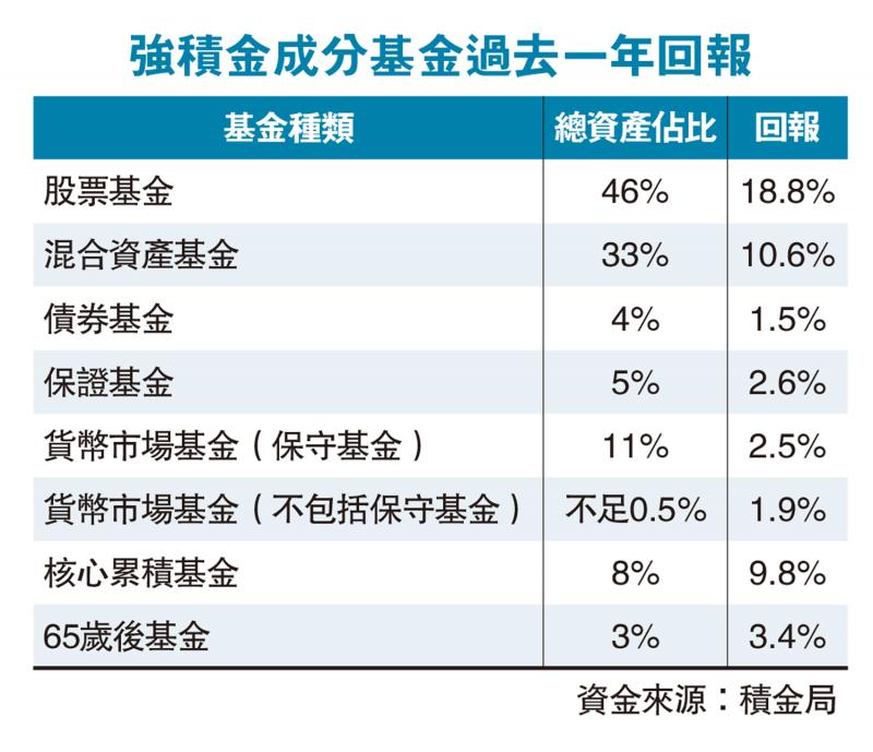 佔強積金總資產合共近八成的股票基金和混合資產基金,在過去12個月的平均淨回報分別達18.8%及10.6%,這兩類基金自強積金制度實施以來,平均年率化淨回報分別為5.1%和4.5%。