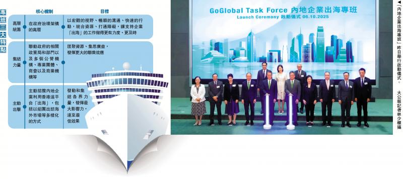 特區政府新成立的「內地企業出海專班」昨日正式啟動,財政司司長陳茂波表示,專班具有三大特色:「高層統籌」確保資源整合、打通障礙;利用「集結力量」,統籌政商、專業團體等界別力量形成聯乘效應;採取「主動出擊」策略,通過招攬企業和組團出訪開拓海外市場。負責督導該專班的商經局局長丘應樺表示,希望透過這個平台,匯聚各方專業力量,讓內地企業有序走向世界,同時能轉化為香港經濟的新動能,進一步鞏固國際商貿樞紐的地位。\大公報記者 李樂兒