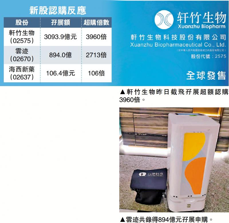 上圖:軒竹生物昨日截飛孖展超額認購3960倍。下圖:雲迹共錄得894億元孖展申購。