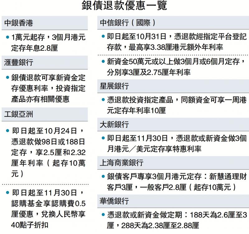 •即日起至10月24日,憑退款做98日或188日定存,享2.5厘和2.32厘年利率(起存10萬元)