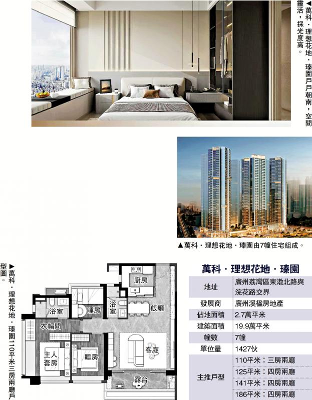 萬科.理想花地.瑧園共有7幢住宅,採用圍合式布局,除了其中一座之外,均做了扭轉設計,戶戶朝南。目前主推110至186平米三至四房戶型,間隔靈活,其中110平米三房兩廳戶型可改四房,全開間朝南,約11.3米南向採光面;125平米四房兩廳戶,四開間朝南,約12.8米採光面,觀景露台寬6.6米;141平米四房兩廳戶,約14.6米採光視野,景觀大露台寬約8.2米,主人套房270度全景採光;186平米四房兩廳戶型,四開間朝南,採光面達18.3米,享一線花地灣河涌景觀視野。