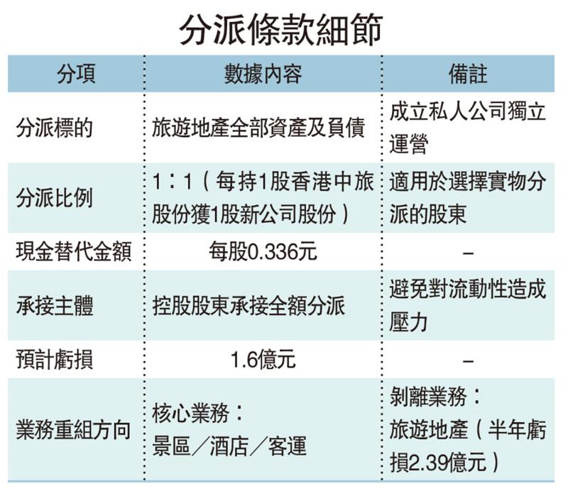 該公司董事局表示,旅遊地產業務近年持續表現不佳,且其資本密集、周期波動的特性為集團帶來不確定風險。通過此次分派,集團希望降低負債水平,減少在地產市場的風險暴露,並將管理及財務資源集中投入於更具增長潛力的業務,包括主題公園、自然景區、旅遊證件及客運服務等。董事局認為,建議分派完成後,集團的盈利能力預期將會改善。集團亦將進一步優化營運模式,在核心業務上配置更多資源。