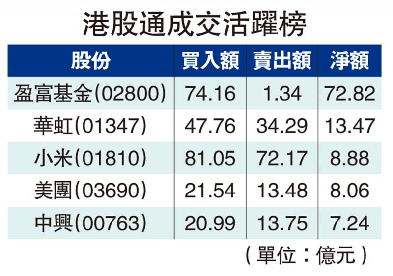 【大公報訊】港股遭遇投資者拋售,南下資金卻積極入市部署,北水投資者昨日經由港股通買入1234.11億元,較上日增加47%,扣除賣出額,淨買入198.04億元,是8月15日以來最多。久違的盈富基金(02800)重新進入港股通活躍股份榜單,南下資金合共買入74.16億元,扣除賣出額,淨買入達72.82億元,是吸金量最多的股份。