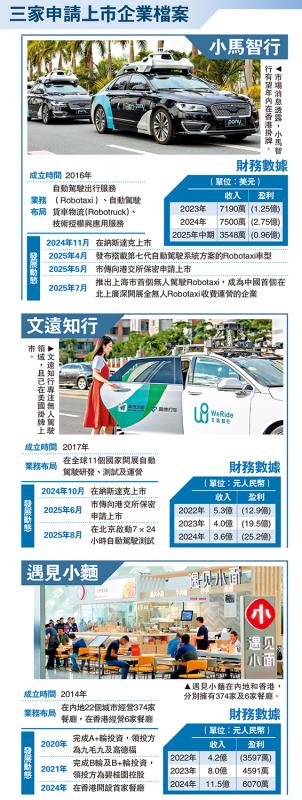 內地企業赴港上市步伐加快,中證監昨日一口氣批准三家企業赴港上市,其中包括兩家已在美國掛牌的無人駕駛技術公司─小馬智行(PONY.US)與文遠知行(WRD.US),以及今年4月提交申請的連鎖餐飲品牌「遇見小麵」。分析指出,此舉具有多重意義,不僅反映大型中概股正加速回流香港,亦將有助促進香港無人駕駛產業的發展。\大公報記者 蔣去悄