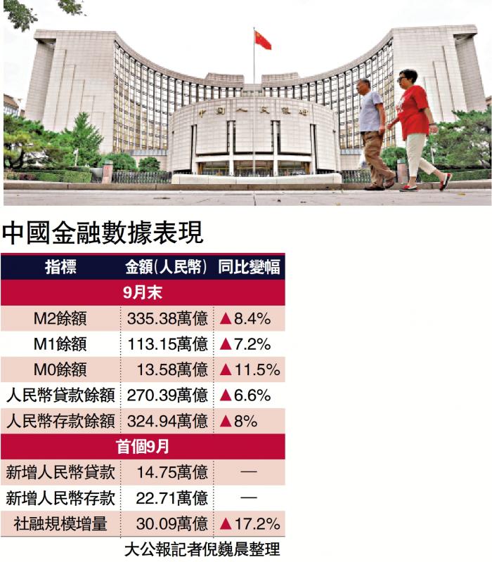 中國人行數據還顯示,截至9月末,M2(廣義貨幣)、M1(狹義貨幣)及M0(流通中貨幣)同比增長分別為8.4%、7.2%及11.5%。M2與M1之間的「剪刀差」為1.2個百分點,較8月末收窄1.6個百分點,為年內新低。