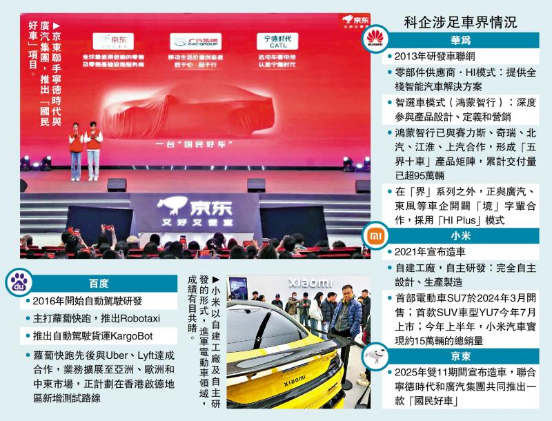 上圖﹕京東聯手寧德時代與廣汽集團,推出「國民好車」項目。下圖﹕小米以自建工廠及自主研發的形式,進軍電動車領域,成績有目共睹。