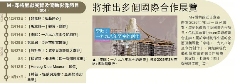 M+博物館近日宣布將於2026年推出一系列展覽、流動影像節目及國際合作項目,包括與首爾Leeum美術館聯合主辦,關於李昢創作生涯的全面回顧展覽「李昢:一九九八年至今的創作」、與紐約現代藝術博物館首個合作展覽「珍妮特.卡迪夫:四十聲部經文歌」等。