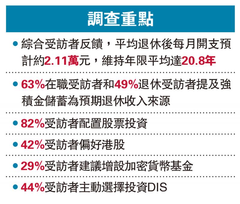 調查顯示,強積金儲蓄是在職人士最常提及的預期退休收入來源,佔比約63%,亦是最多退休人士提到的收入來源,佔比約49%。綜合多位受訪者回應,預計平均退休後每月開支約2.11萬元,維持年限平均達20.8年。其中18至29歲的僱員預期需要更高的每月資金需求,約2.33萬元,資金維持年限則較為樂觀,料可維持22.6年。