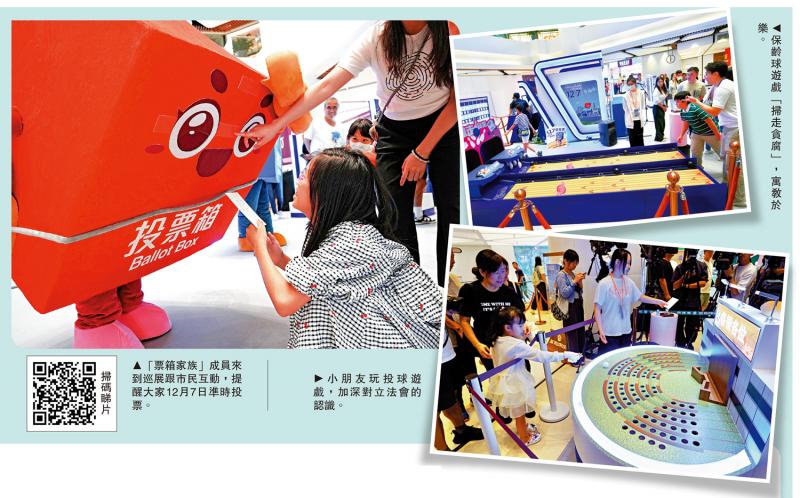左圖:「票箱家族」成員來到巡展跟市民互動,提醒大家12月7日準時投票。右上圖:保齡球遊戲「掃走貪腐」,寓教於樂。右下圖:小朋友玩投球遊戲,加深對立法會的認識。