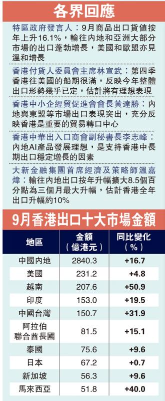 特區政府發言人:9月商品出口貨值按年上升16.1%,輸往內地和亞洲大部分市場的出口蓬勃增長,美國和歐盟亦見溫和增長