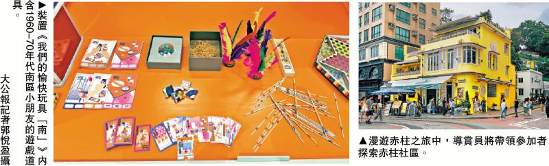 左圖:裝置《我們的愉快玩具「南」》內含1960-70年代南區小朋友的遊戲道具。/大公報記者郭悅盈攝;右圖:漫遊赤柱之旅中,導賞員將帶領參加者探索赤柱社區。