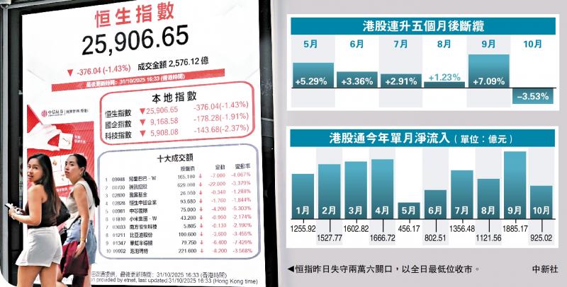 利好消息盡出,港股連跌三日。恒指昨收市跌376點,失守二萬六心理關口,並以全日低位25906點報收,令10月跌幅擴大至948點,五個月連升紀錄斷纜。大市走低,惟近40隻藍籌逆市向上,獲提私有化的恒生(00011)月升27.9%,成為10月藍籌股王。展望後市,證券界人士相信,恒指11月初將會在25500至26500點區間上落。中信証券看好受惠出口關稅下降的資訊科技、消費、工業等板塊。\大公報記者 劉鑛豪