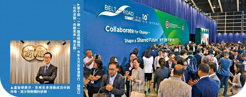 左圖:盧金榮表示,愈來愈多港商成功分散市場,減少對美國的依賴。右圖:第十屆「一帶一路高峰論壇」今年九月在香港舉行,論壇以「合作求變、共建未來」為主題。