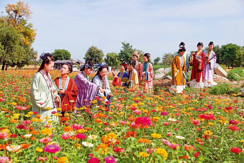 二○二五年圓明園金秋遊日前於北京開幕。金秋遊期間,美麗的秋景與豐富多彩的文化活動,令遊客在秋遊的同時感受圓明園深厚的文化底蘊。圖為「十二美人」在花海中漫遊,「十二美人」源自《清人畫胤禛妃行樂圖》,又名《十二美人圖》,原是圓明園「深柳讀書堂」圍屏上的裝飾畫。\中新社