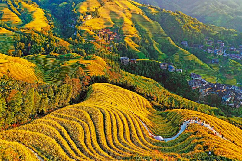 圖:近日,在廣西壯族自治區桂林市龍勝各族自治縣龍脊梯田,遊客在觀光遊覽。\新華社
