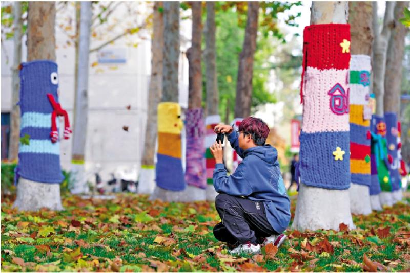 近日,隨着氣溫下降,北京國際關係學院為校園內的部分梧桐樹穿上「毛衣」,吸引師生打卡拍照。 中新社