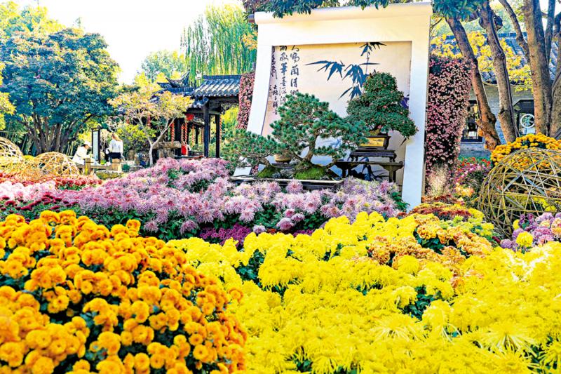 近日,人們在江蘇揚州个園景區「菊隱个園,四時閒趣」為主題的精品菊展上賞菊遊玩。\新華社