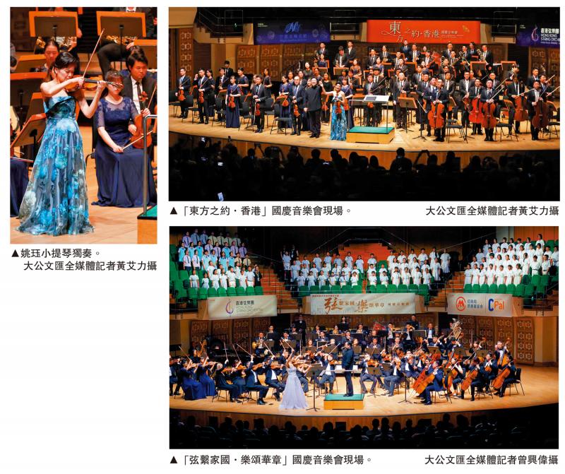 左圖:姚珏小提琴獨奏。右上圖:「東方之約.香港」國慶音樂會現場。\大公文匯全媒體記者黃艾力攝;右下圖:「弦繫家國.樂頌華章」國慶音樂會現場。\大公文匯全媒體記者曾興偉攝