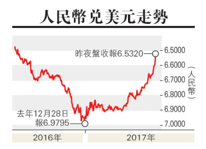 在岸人民幣大漲,也導致離岸人民幣兌美元昨日午後升破6.53元關口。傍晚後美元反彈收復部分失地,截至昨晚十一時三十分,在岸及離岸人民幣兌美元分別報6.5320及6.5294。