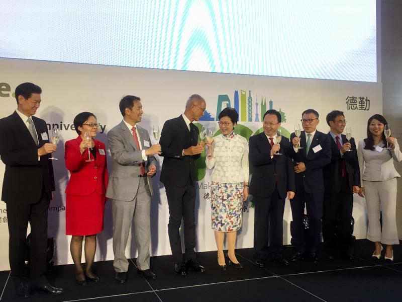 圖:德勤中國管理團隊與嘉賓林鄭月娥(右五)及譚鐵牛(右四)等舉杯,共同祝賀德勤百年慶,開創新紀元