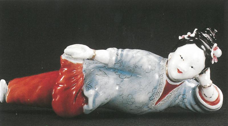 例如附圖,為清代瓷胎粉彩「美人橫卧」型鼻煙壺(長約九公分),斜卧美人一手托髮鬢,另一手扼着屈起的小腳。壺蓋為其髻端,可揭開;體內中空藏鼻煙,設計匠心獨運。其實,這種卧女造型,乃源於宋、金時期的陶瓷枕,至元、明不稍衰。卧女枕以橫陳美女為座,上置枕面。風流雅士用作薦首,保證「濃睡不消殘酒」(李清照《如夢令》句),只會綺夢連綿,感到艷福無邊倍銷魂;總遠勝那時的卧虎枕,至少覺得並非與虎同眠和做夢也提心吊膽。