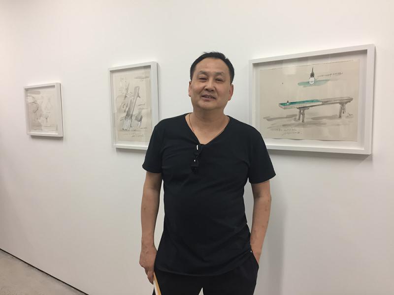 圖:多媒體藝術家王功新及其作品設計草圖/大公報記者王豐鈴攝