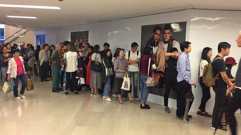 圖:昨日接近下午五時,歷山大廈升降機大堂處仍有長龍排隊等候觀畫/大公報記者黃璇攝