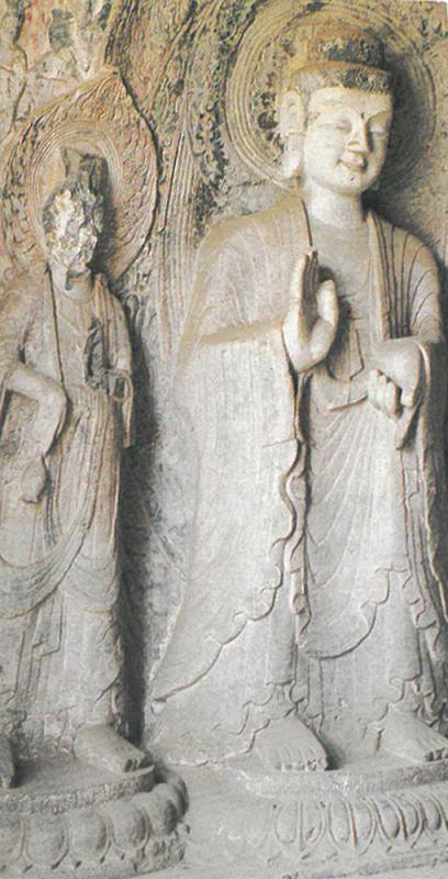 古都洛陽南郊不遠處,伊水北流;西岸龍門山與東岸香山,石壁峭立,對峙形如門闕,故稱「龍門」,就是《水經注》所指的「伊闕」。龍門石窟,開鑿兩岸崖壁上。從北魏時南北朝,直至盛唐,經歷約四百年。一公里的崖壁,有二千三百多所窟龕,立體圓雕和浮雕石像十萬餘尊,如鬼斧神工。中國古代宏偉精美的雕刻藝術,可說與大自然石壁渾成一體。例如附圖,為龍門石窟賓陽中洞(另有南洞和北洞)石雕佛像及脇侍像(局部),乃北魏玄武帝時所雕刻。雖然造型受古天竺秣菟羅、笈多初期和犍陀羅樣式影響,但卻蘊涵北魏拓跋鮮卑族的審美觀,線條單純,相貌堂堂,體態文靜,衣紋流鬯,質樸敦厚,予人和穆慈祥之感;自然具活力,不落造作的痕跡。