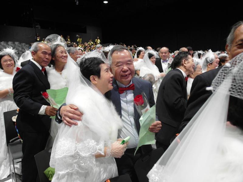 圖:東聯基金為長者婚紗攝影。百對盛裝打扮的「新人」,在大家見證之下,宣讀誓言,互許終生