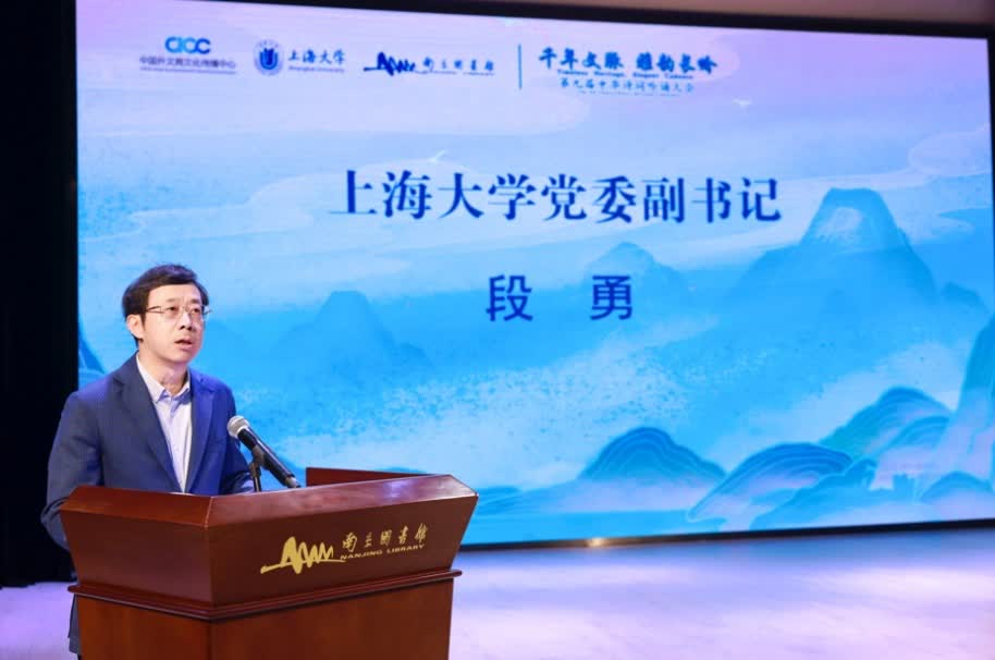 段勇在致辭中代表上海大學向嘉賓們致以熱烈歡迎,表示中華詩詞吟誦大會首次走出校園、走出上海,離不開南京圖書館的鼎力支持;本屆大會群英薈萃,希望以聲為媒、以文為橋,共繪文明互鑒華章,讓世界聽見中國聲音、讓文化在對話中生生不息。
