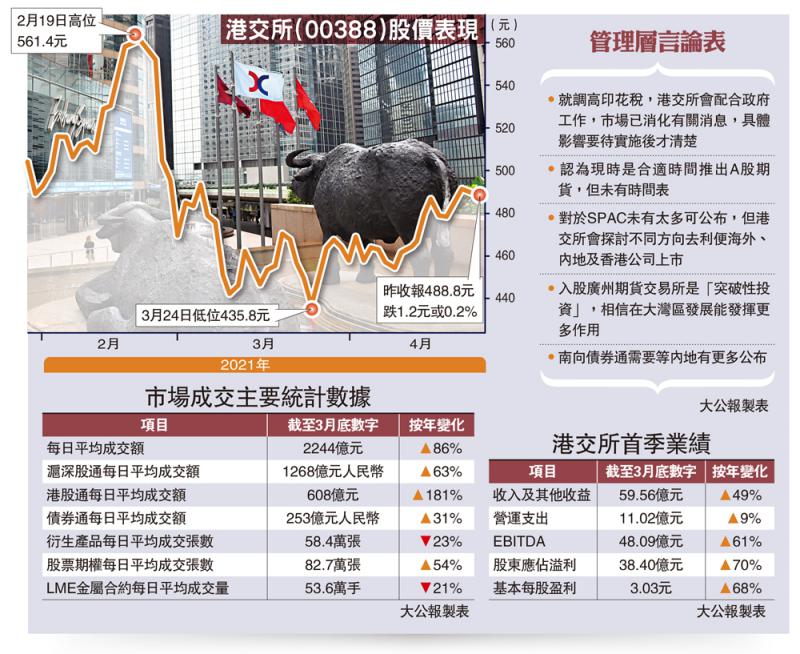 受到1月強勁的成交額帶動,港交所(00388)首季純利按年增七成,達破紀錄的38.4億元,符合市場預期。但踏入第二季,港股交投明顯回落,加上政府將於今年8月調高印花稅,代理集團行政總裁戴志堅表示,4月港股交投雖有所回落,但仍較去年同期上升。他又指,市場已消化調高印花稅消息,港交所會配合政府工作,並要待調高印花稅後才會清楚相關影響,而港交所亦會持續研究增加交投的方法。\大公報記者 王嘉傑