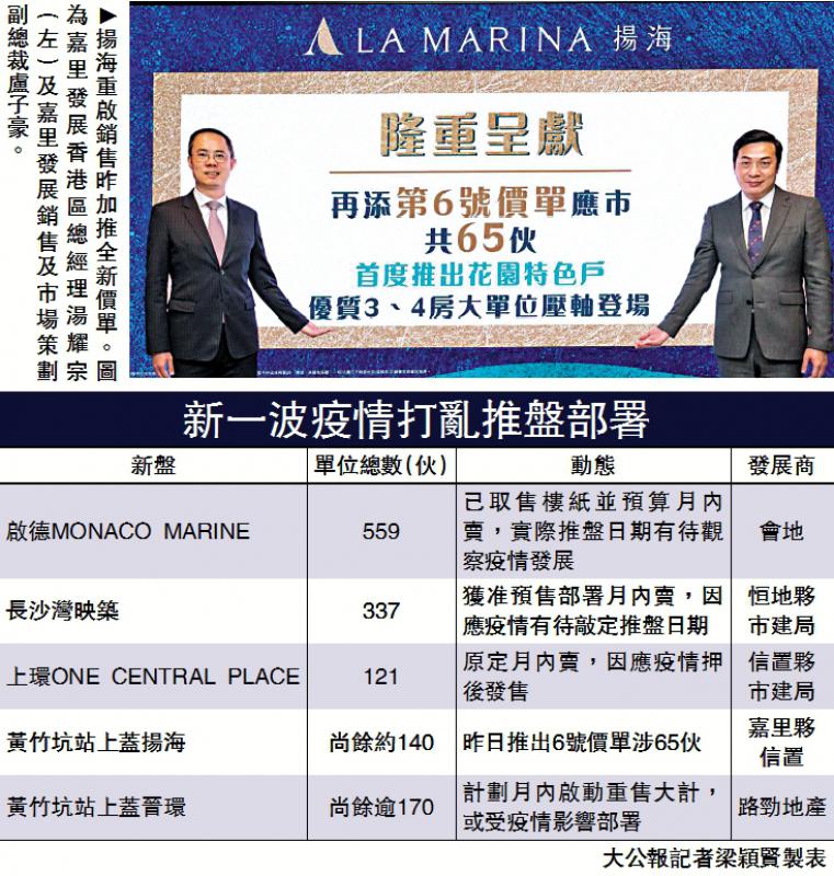 至於部分原正計劃於本月重新啟動推盤攻勢的項目,包括黃竹坑站上蓋首兩期的晉環及揚海,前者暫未有動靜;而原定昨日舉行記招公布詳情的揚海,為免多人聚集,取消記招改以發放新聞稿以策安全。