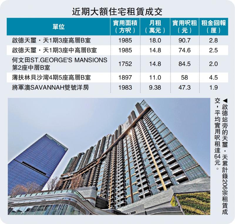 由於專才普遍傾向選址高質素住宅,刺激豪宅市場租賃愈趨活躍。代理消息指出,天璽.天1期3座高層B室,實用面積1985方呎,採4房雙套間隔,以屋苑破頂價月租18萬元租出,折合實用呎租90.7元,締造啟德新區租金及呎租之巔,並刷新東九龍分層住宅租金紀錄。據資料,業主於2024年12月以7755萬元向發展商一手買入上址,早前以9100萬元放售,同時以20萬元放租,現略減2萬元租出,享租金回報約2.8厘。