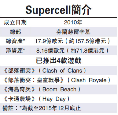 截至2015年12月底止,Supercell淨資產為8.16億歐元(約71.8億港元)。2015年全年稅後盈利為6.93億歐元(約60.6億港元),按年增近63%,以此計算,騰訊今次的收購作價,相等於Supercell的2015年歷史市盈率約13倍。