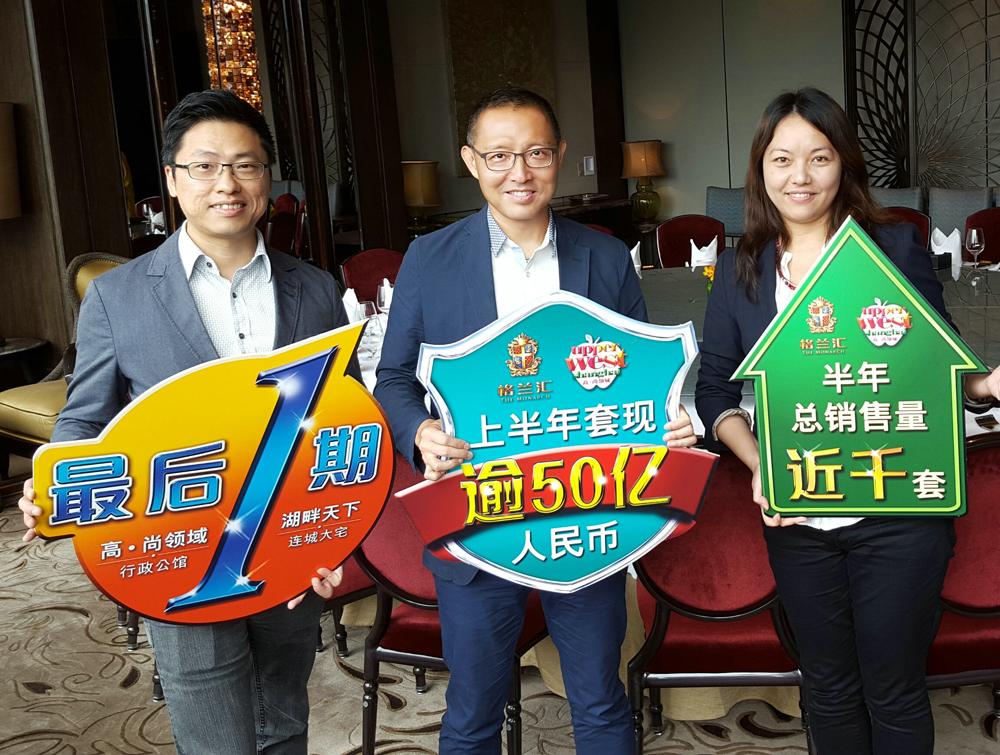 7oso =:郭子威(中)表示,長實在滬兩大項目,上半年成交近千套房源,成功套現逾50億元