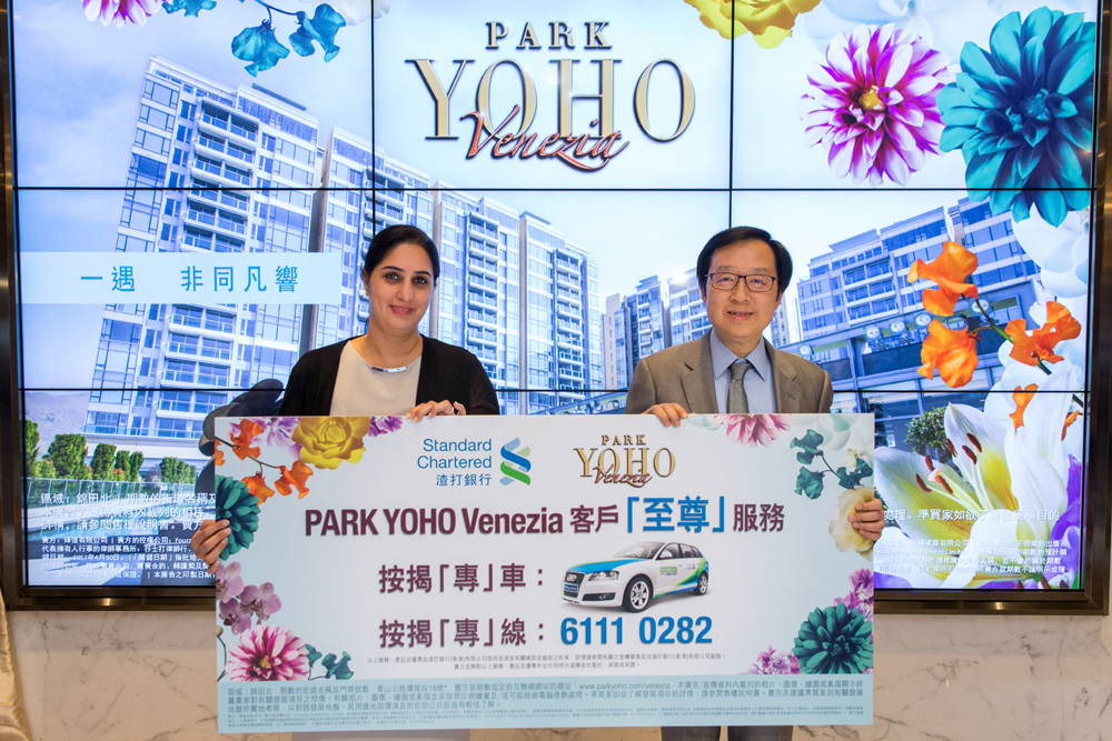 圖:雷霆(右)稱PARK YOHO 1B期入票反應理想,今午截止登記認購。旁為渣打銀行香港有抵押貸款產品執行董事申泰蒙娜