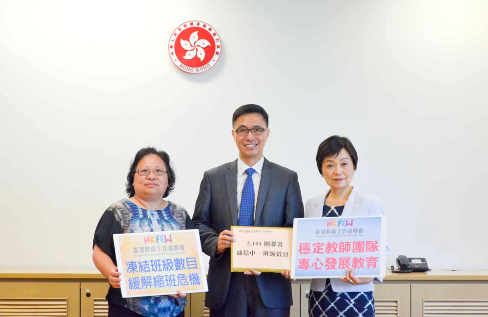 適齡中學生人數持續下跌,教聯會昨日約見教育局副局長楊潤雄及政治助理施俊輝,遞交了2103個中學教師簽名,要求政府撥出額外資源,將未來兩年中一班級數目,凍結在2015/16學年的水平,以穩定教師團隊。教聯會副主席蔡若蓮表示,中一人口持續下跌,不少學校收生不足,縮班危機迫在眉睫,嚴重影響教育生態。不少學校為求生存,出現「搶學生」情況,教師淪為推銷員,影響教育質素,當局雖延長「三保」措施,但力度仍不足以協助學校渡過危機,要求凍結未來兩年中一班級數目,並建議全面檢討教師人手編制,以及增撥資源支援收生能力較弱的學校。圖左:教聯會副主席洪詠慈、教育局副局長楊潤雄、教聯會副主席蔡若蓮。