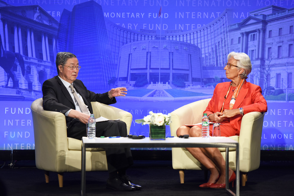 圖:周小川(左)稱,人民銀行特別關注人民幣還不能自由使用的領域,確保人民幣達到可自由使用的標準。旁為國際貨幣基金組織總裁拉加德 新華社