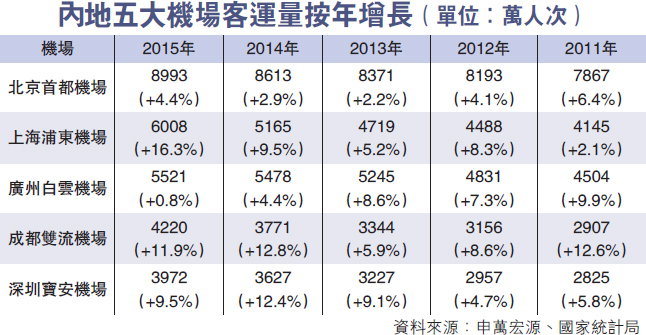 雖然首都機場旅客量「高朋滿座」,但瑞信關注其利用率進一步提升空間有限,導致業務發展陷入瓶頸。瑞信指出,自從第三航運大樓於2008年啟用後,首都機場的利用率在2015年升至95%;旅客處理能力利用率更達到110%。瑞信預期,首都機場未來五年旅客處理量的年複合增長只有2.6%。